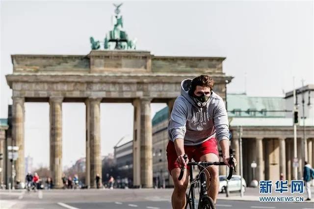 3月28日,在德国首都柏林,一名男子骑自行车经过勃兰登堡门。