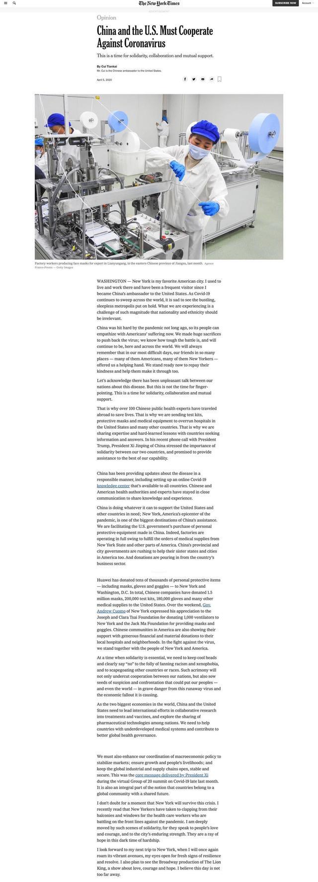 2020年4月5日,中国驻美国大使崔天凯在美国《纽约时报》发表题为《同舟共济 定克时艰》的署名文章,讲述了中国为全球抗击疫情做出的努力,表示中美两国应该团结起来相互合作,共渡难关。