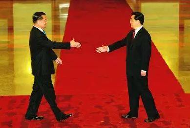 当时胡锦涛率先从大会堂内部举行会谈的会议厅走出来,站定之后,连战则从外而内,两人互相把手伸向对方握手,时间长达数秒之久,这样才实现了历史性的握手。