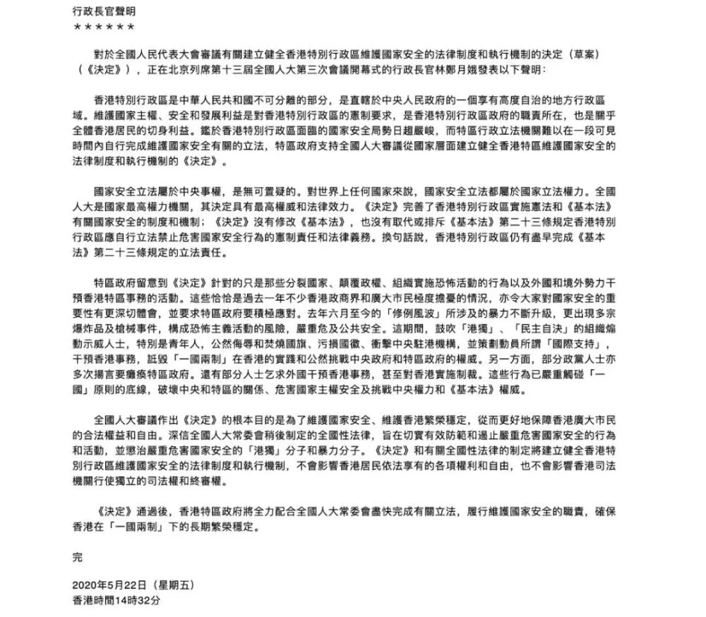5月22日,林郑月娥发表声明,表示支持涉港决定草案(图源:香港特区政府官网)