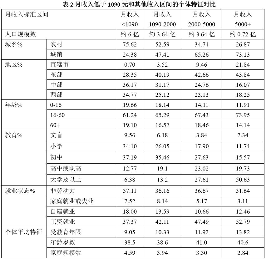 月收入在1090元以下的6亿人是一个怎样的群体?表2发现,在月收入低于1090元的群体中,来自农村的比例高达75.6%,远远高于其他收入群体的占比,这说明绝大部分低收入群体仍然分布于农村地区,城乡分割仍是中国特色最大的问题之一。