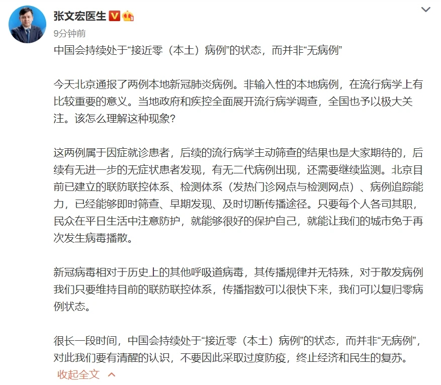 张文宏:中国本土病例会持续处于“接近零”而并非零的状态