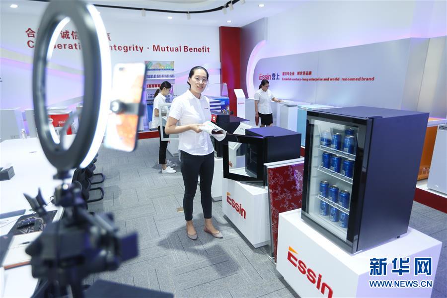 6月15日,在青岛营上电器有限公司,营销人员通过广交会直播平台推介出口到海外市场的冰箱。 当日,第127届广交会拉开帷幕。这是我国首次将广交会整体性“搬上云端”。本届广交会会期10天,保持24小时不间断,按16大类商品设置50个展区,180万件展品同期上线展示。 新华社发(梁孝鹏 摄)