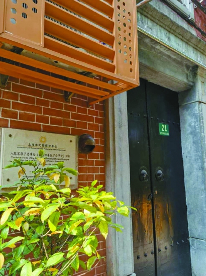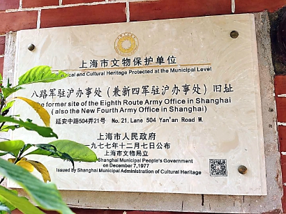 弄内21号,标准的石库门门洞,水泥门框,线条流畅,门楣极为简约,仅用凹凸块状和线条勾勒对比加深门楣的立体感,使之显出一些气派来。漆黑的双开大门,门旁墙上一块白色铭牌上是中、英文的说明:“上海市文物保护单位 八路军驻沪办事处(兼新四军驻沪办事处)旧址 上海市人民政府 一九七七年十二月七日公布 上海市文物局立。”而其实,该址在1962年9月7日,就被上海市人民政府公布为上海市文物保护单位。