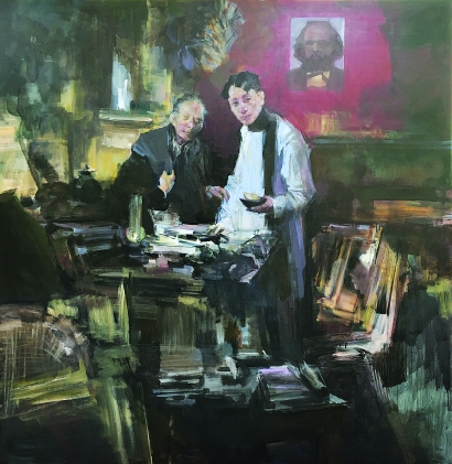 ◆俞晓夫油画《真理的味道》,画的正是陈望道翻译《共产党宣言》时那个关于“真理的味道是甜的”的故事,当时陈望道只顾奋笔疾书,误把墨水当成红糖水
