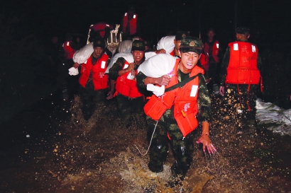7月8日凌晨,武警江西省总队景德镇支队官兵在珠山区观音阁地区搬运沙袋加固昌江堤坝。新华社发(曾勇摄)