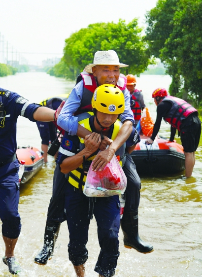 7月13日,江西省九江市永修县三角乡,救援人员将一名村民背下橡皮艇。 新华社记者 张浩波摄