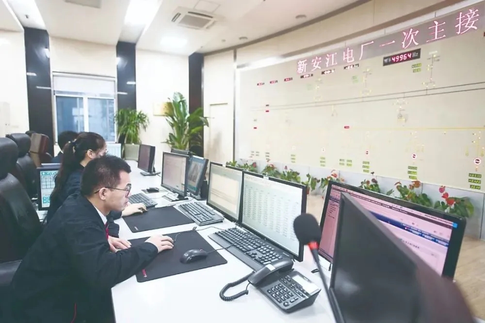 新安江水库是华东地区最大的水库,在钱塘江流域的防洪度汛中起到关键作用。受持续降水影响,新安江水库水位持续快速上升,水库于7月8日打开全部9个泄洪闸泄洪,进行防洪调度。图为新安江电厂工作人员在坝体内部中央控制室工作。新华社记者 翁忻旸 摄