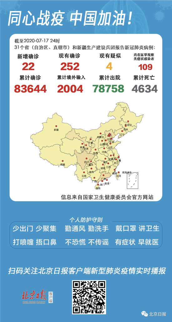 7月17日0—24时,31个省(自治区、直辖市)和新疆生产建设兵团报告新增确诊病例22例,其中境外输入病例6例(广东3例,山东2例,福建1例),本土病例16例(均在新疆);无新增死亡病例;新增疑似病例1例,为本土病例(在新疆)。