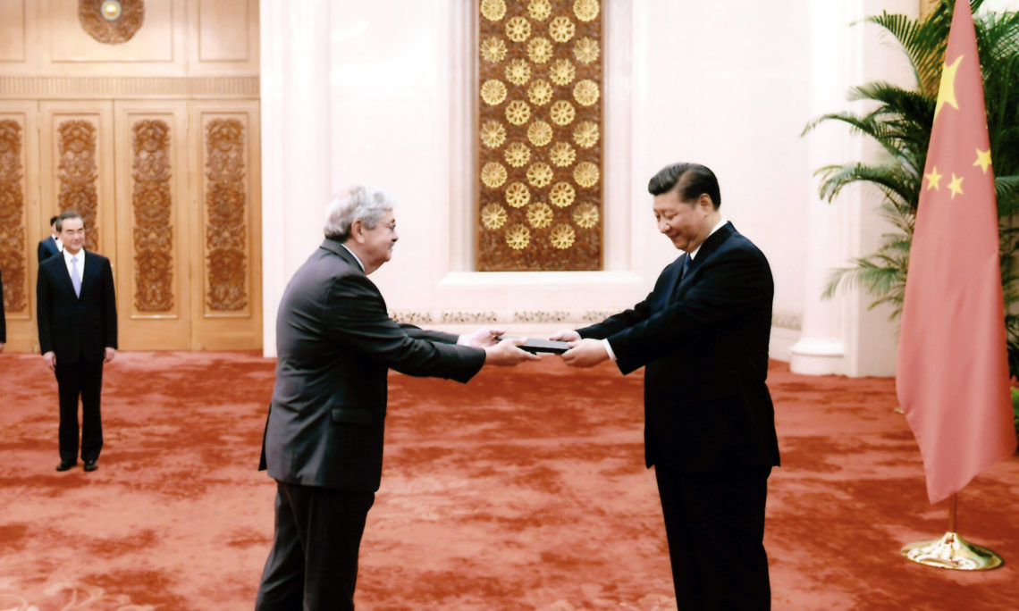2017年7月12日,布兰斯塔德大使在人民大会堂向中国国家主席习近平递交国书,两人第三次握手