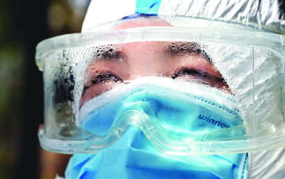 抗疫期间,浦东一家医学隔离观察点的医护人员连续工作,防护镜内满是汗水和热气。 本报记者 赵立荣 通讯员 蒲苇摄