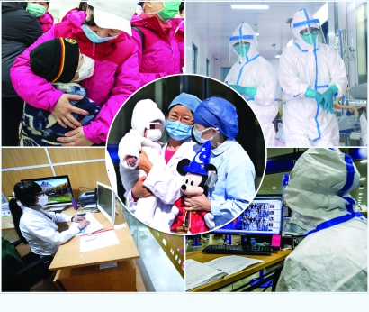 ①即将驰援武汉的医护人员与家人依依不舍道别。 本报记者 赵立荣摄 ②上海市公共卫生临床中心病房大楼内奋战在抗疫一线的医护人员。 本报记者 邢千里摄③徐汇云医院内医生在“云端”接诊。本报记者 袁婧摄 ④机场海关人员查验入境旅客。本报记者 张伊辰摄 ⑤上海年龄最小确诊患儿出院。本报记者 袁婧摄 制图:李洁