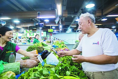 八旬老人张金鸣近几年逛菜市场从来不带钱包,通过手机支付宝扫一扫完成购物。许康平摄/光明图片