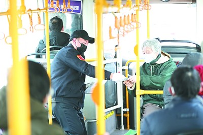 疫情期间,江苏南通公交车辆对使用手机不便的老年人,由站务人员查验身份做好登记后便可乘车。王俊荣摄/光明图片
