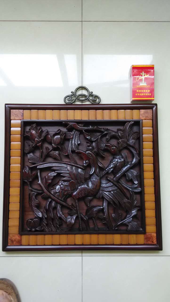 我的另一幅作品:画蕊——凤采牡丹(子母双采篇)四周镶篏——用民国时期的老式麻将牌反面(竹面)作装饰、四只角用应木镶嵌。外围用老红木指纹印式作外框。给人的感觉:竹木结合、豪华大气、相得印彰。这两件作品都可布置房间、点缀家居,提升住所的品味。