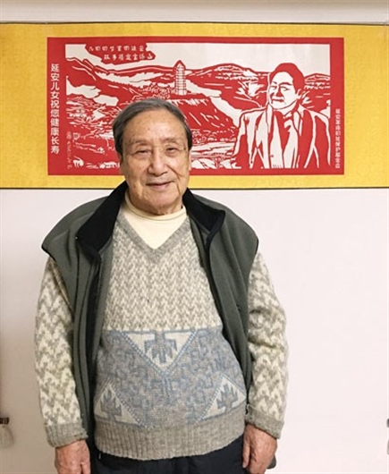 贺敬之站在《回延安》剪纸作品前。 文汇报首席记者 江胜信 摄