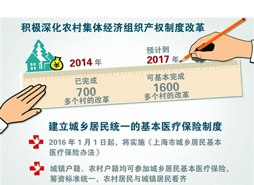 上海还正在积极深化农村集体经济组织产权制度改革,分类推进农村土地制度改革。今年,上海将基本完成农村土地承包经营权确权登记,推动土地规范流转,推动现代农业适度规模经营。在农村集体经济组织产权制度改革方面,去年本市已完成700多个村的村级经济组织产权制度改革,今年可达70%至80%,预计到2017年可基本完成1600多个村的改革。今年还启动了镇级改革试点,在把资产家底摸清的基础上,加快推进镇级农村集体经济组织产权制度改革。