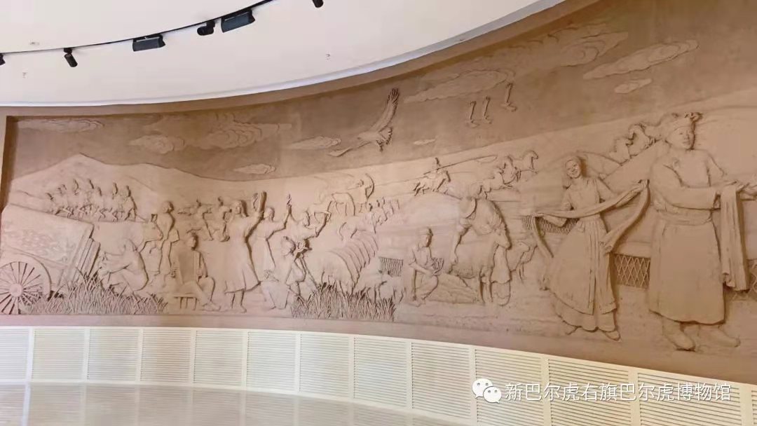 新巴尔虎右旗境内,就看到美丽的大草原,就看到了这里的广阔无垠、辽阔高远。蓝天白云是我们生存的常态,所以在这一组浮雕墙背景图上,我们选择了以蓝天白云下的草原风光画卷作为背景,来衬托我们的生存环境。浮雕墙展现出知识青年来到巴尔虎草原融入到牧区的生活,和牧民一起生产、生活、劳动,并且也成为了传播先进文化现代文明的传播者。