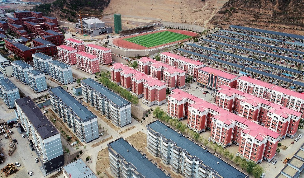 2019年4月24日无人机拍摄的陕西省延安市延川县文安驿镇梁家河小区,干净整洁,高楼林立。