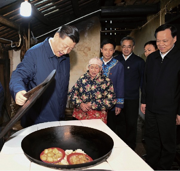 2019年4月,习近平总书记在重庆考察调研。这是在石柱土家族自治县华溪村,习近平深入农户家中,实地了解脱贫攻坚工作进展和解决“两不愁三保障”突出问题情况。