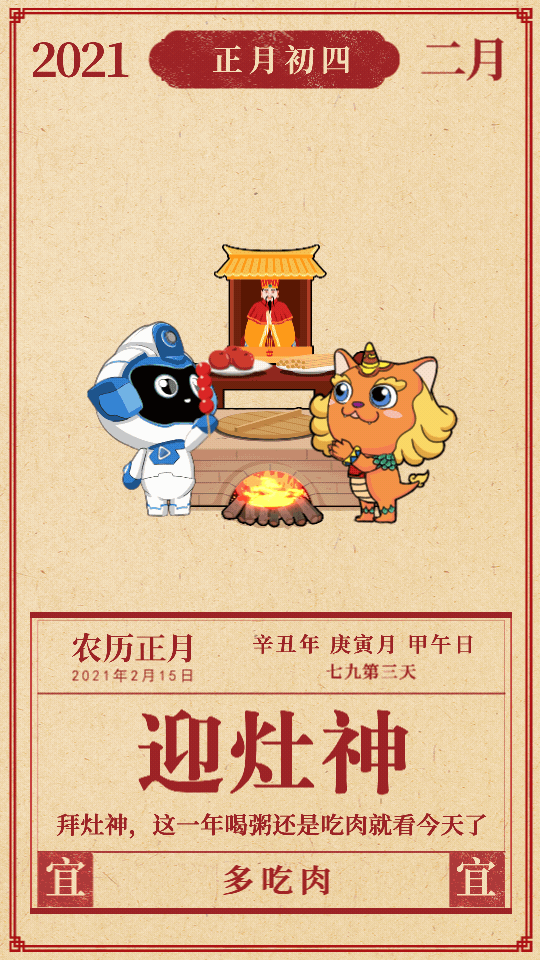 “正月初四,迎灶神”。“灶神”是中国古代神话中司饮食之神。恭迎灶神,愿春夏秋冬一日三餐,和琐碎细小的柴米油盐中皆有幸福的味道。
