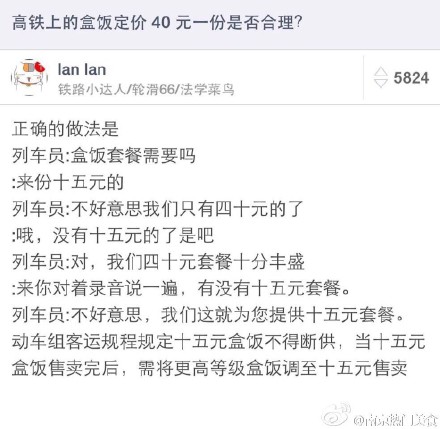 这到底是一个段子,还是确有其事呢?东方网记者了解到,根据《动车组列车服务质量规范》列车经营相关规定,“供应品种多样,有高、中、低不同价位的预包装饮用水、盒饭等旅行饮食品,2元预包装水和15元盒饭不断供。”也就是说,列车上须供应15元盒饭。那么如果乘客在列车上买不到15元盒饭怎么办?