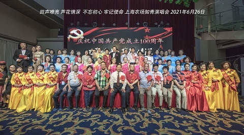上海市属农场知青党员荣获在党50年纪念章,在党旗下合影留念。