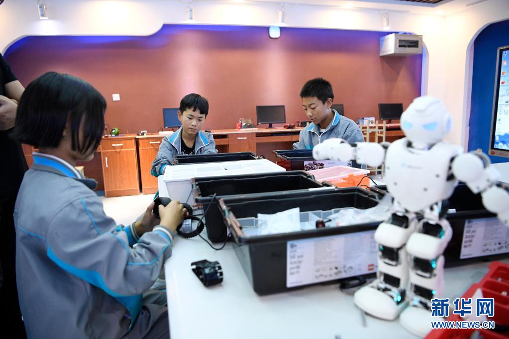 宁夏吴忠市同心县豫海初级中学学生学习机器人组装课程(2020年9月18日摄)。新华社记者 王鹏 摄
