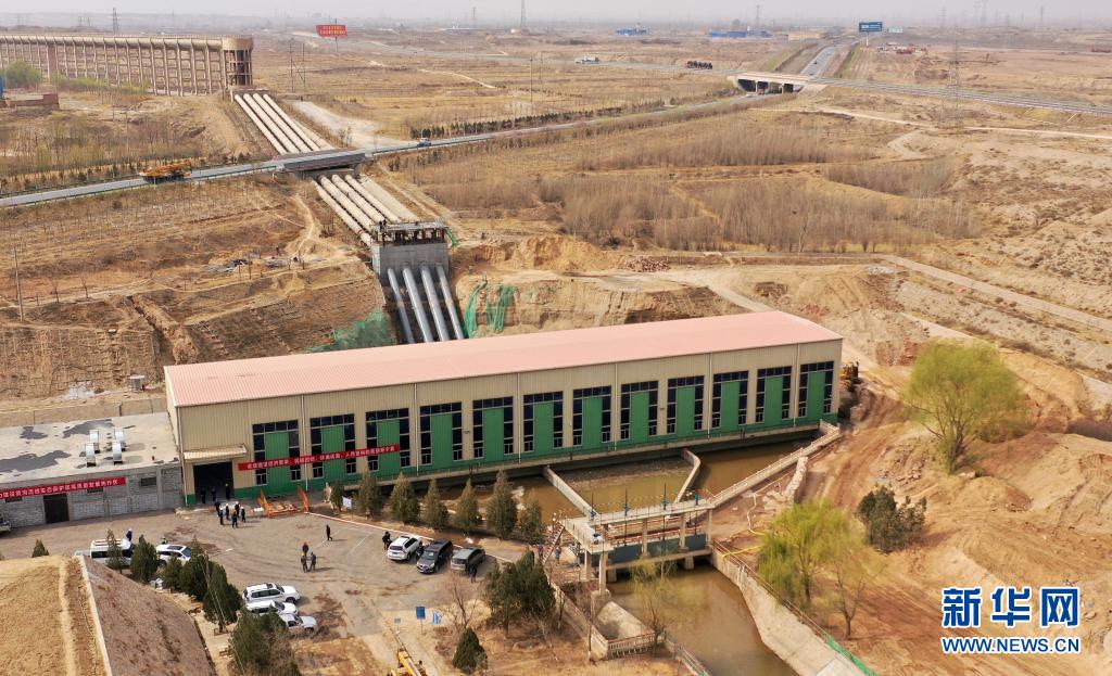 3月25日,位于宁夏中卫市中宁县境内的宁夏固海扩灌扬水更新改造工程一泵站顺利通水试运行。该泵站可保障宁夏吴忠市红寺堡区、同心县,中卫市中宁县等中部干旱带5个县区的68万亩农田春播春灌工作(无人机照片)。新华社记者 王鹏 摄