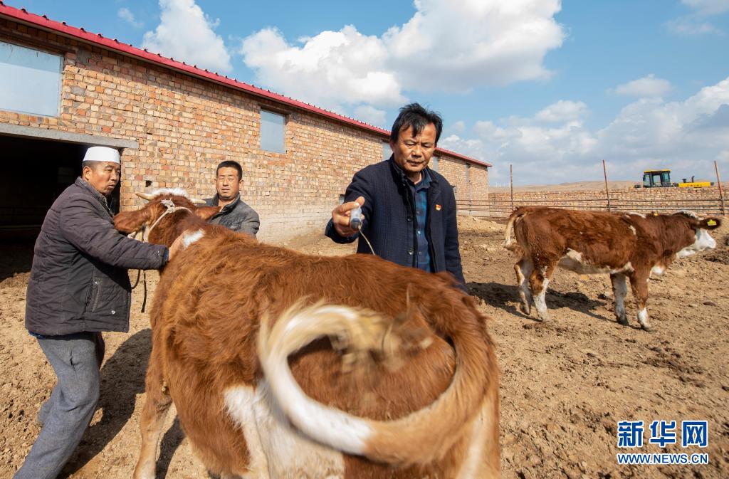 宁夏吴忠市同心县河西镇旱天岭村村支书丁建华(右)给牛打针(2019年11月7日摄)。新华社记者 杨植森 摄