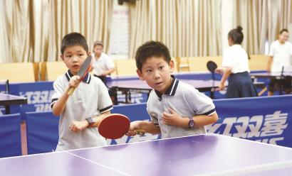 在蓬莱路二小的“蓬莱小镇”夏令营,学生们积极参加乒乓球训练。 蔡维帅摄