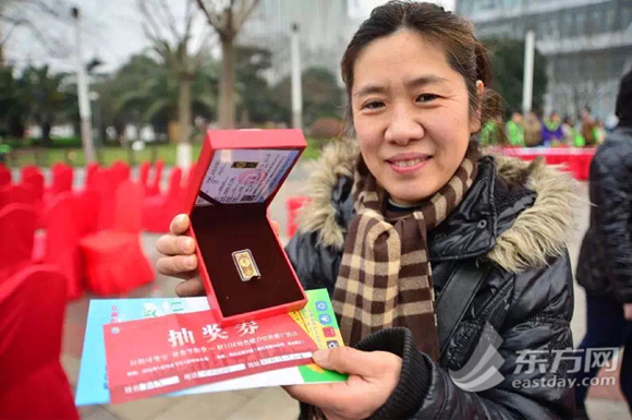 当天,虹口区在四川北路绿地举行“垃圾可变宝,黄金等你拿”绿色账户宣传推广活动,300多名参与了绿色账户的居民,通过绿色账户网站积分兑换了抽奖机会,现场抽取了金条、银条、银币、电饭锅等奖品。单阿姨成为了最大的幸运儿,获得了价值3000元的10克金条一根。
