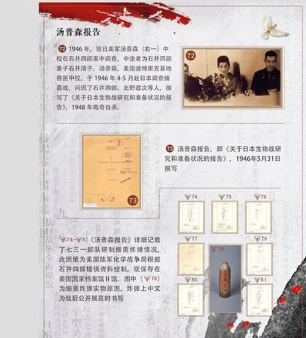 侵华日军第七三一部队罪证陈列馆馆长金成民说,研究发现,二战结束后,美国对日本拥有的生物武器及其数量非常感兴趣。为谋求独占731部队细菌战、人体实验等方面的数据资料,美军德特里克堡基地先后派出4任调查官,和731部队主要成员接触,最后达成交易。