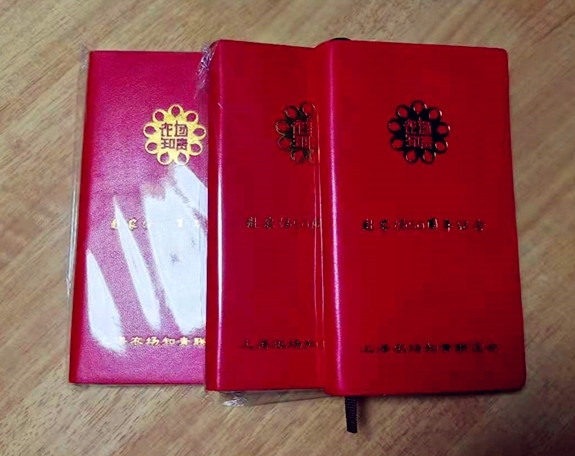 笔记本封面的上方烫金印制了上海农场知青网的LOGO;中间烫金印制了“赴农场50周年纪念”,落款是“上海农场知青联谊会”。
