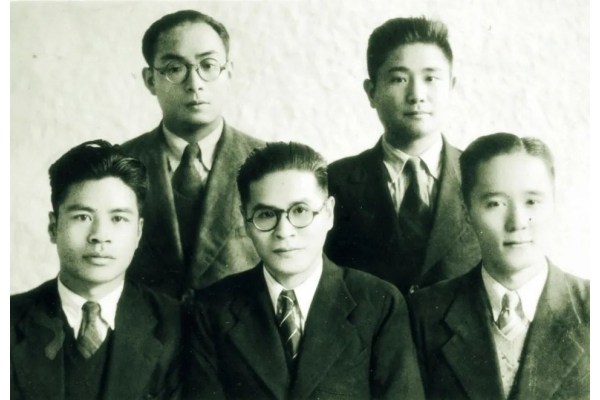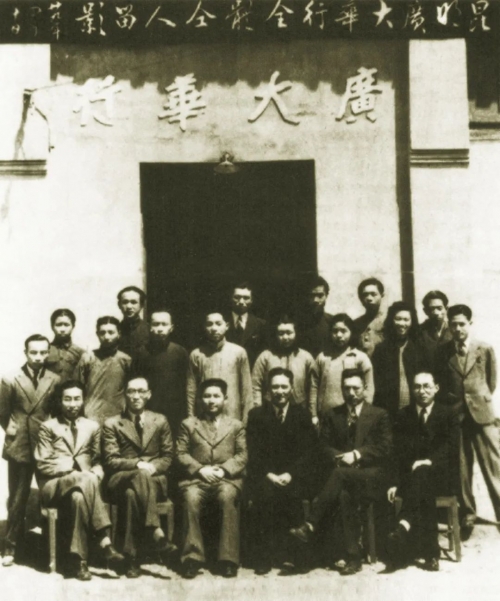 1933年,杨延修等5位有志青年合资创办了广大华行。1937年至1938年间,卢绪章、杨延修、张平先后加入中国共产党,广大华行被中共南方局改建为党的秘密工作机构,由卢绪章任董事长、总经理兼党组书记,杨延修任副总经理。图中前排左起:卢绪章、田鸣皋、张平;后排左起杨延修、郑栋林