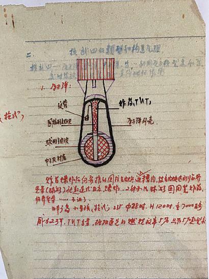 原公浦的珍贵笔记。图中显示的是原子弹核心部件构造。