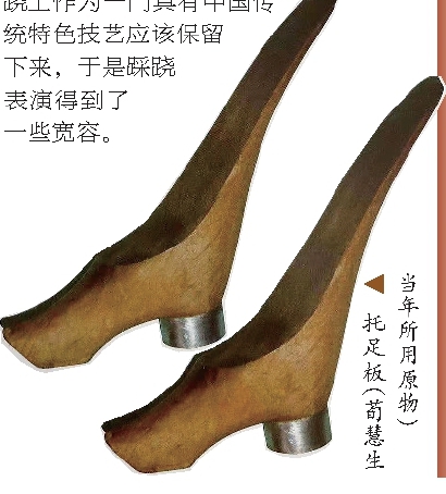 “这几年外界又开始重视我,这同踩跷或者叫跷工艺术濒临绝境有关。”原来辛亥革命以后缠足逐渐不再时髦,“小脚女人”更被认为是封建落后的象征,于是科班和戏校也就不设这个课程了。改革开放以来,随着对传统文化的提倡以及认识的深入,有识之士指出当代中国男性已经不会因看舞台小脚而去崇拜“三寸金莲”,跷工作为一门具有中国传统特色技艺应该保留下来,于是踩跷表演得到了一些宽容。