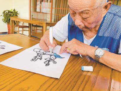 一位老人正为画作涂色。 李成东 摄