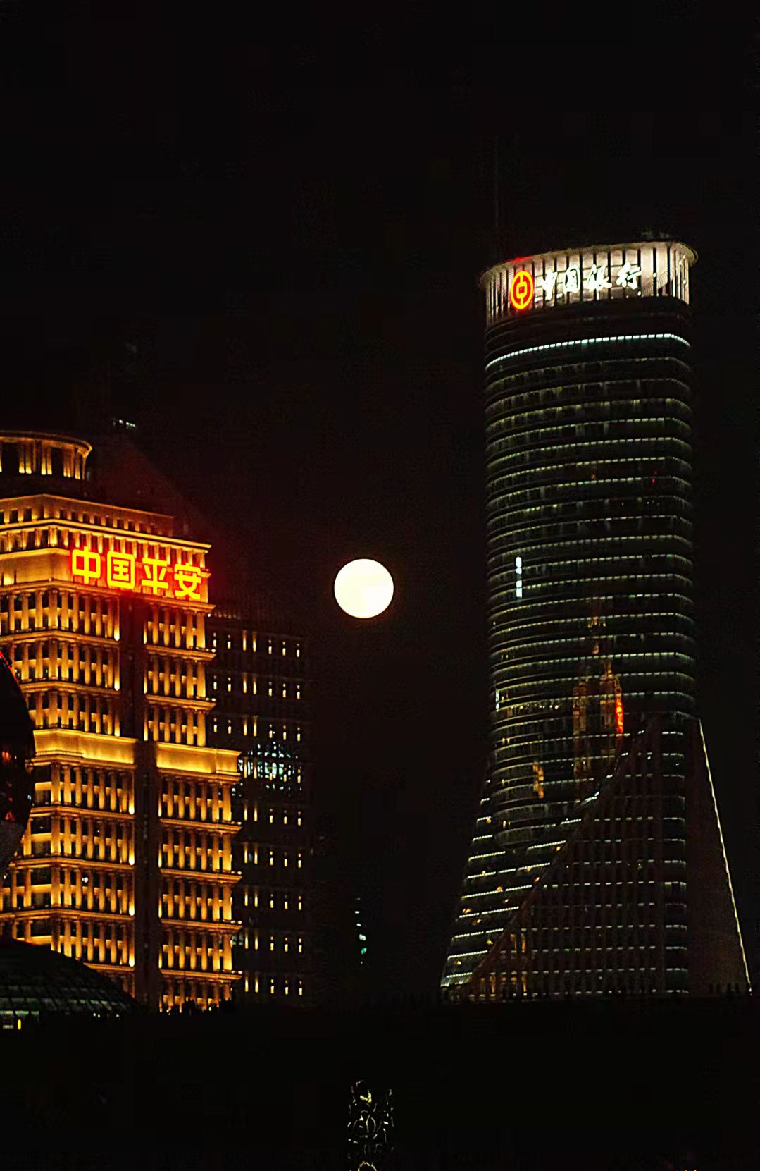 突然有人在惊呼:“看中国银行那边!”哦,一轮金黄的圆月正从平安大楼后羞答答地探出头来,渐渐来到楼间的空隙中。