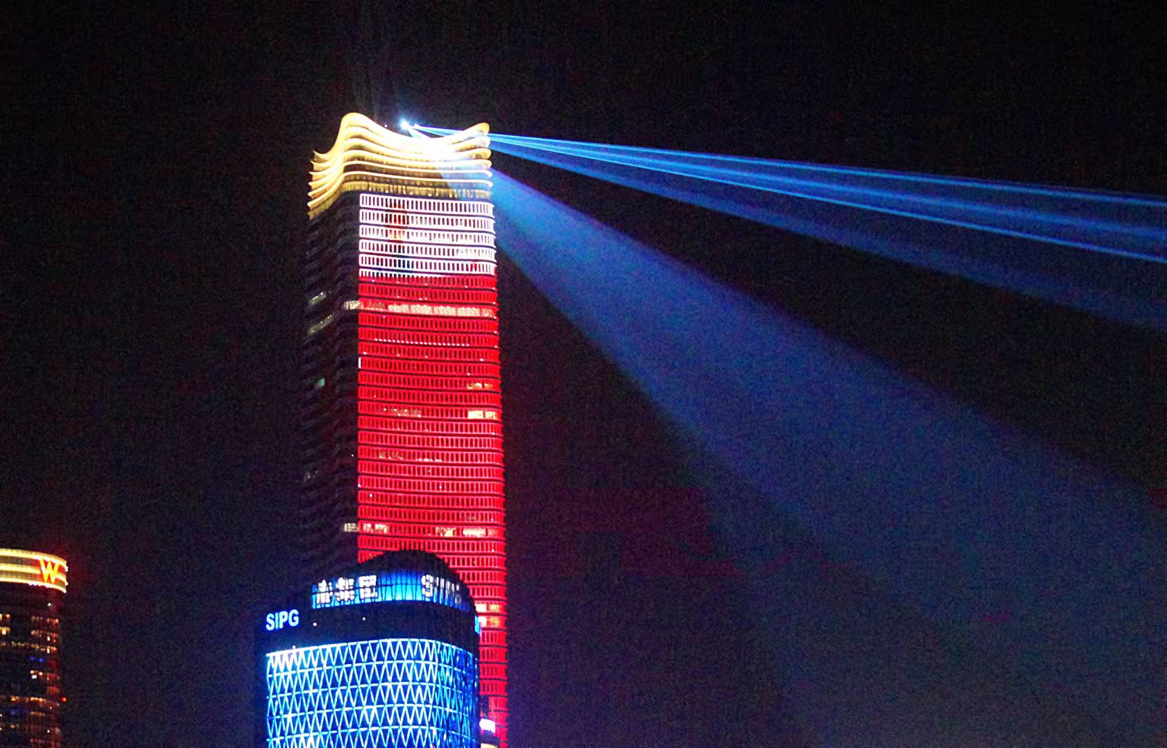 只有北外滩上白玉兰大楼不领情,早早亮起了灯,而且还将楼顶的探照灯射向两岸。