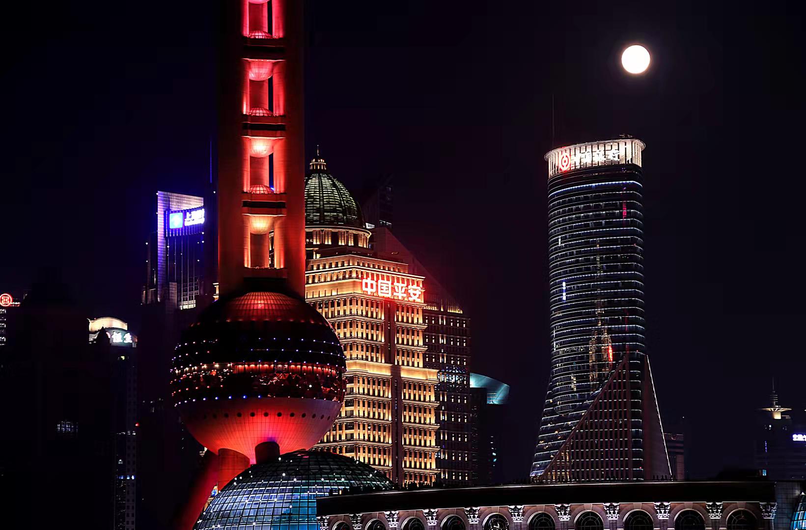 8点多,离开外滩时,站在南京东路步行街上回望,月已升至环球中心、金茂大厦的上空,照耀着这一片改革开放最活跃的土地。