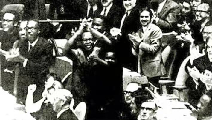 1971年10月18日至25日,第二十六届联合国大会就恢复中华人民共和国在联合国的合法权利提案进行专题辩论,提案参加国由18个增至23个,约80个会员国代表发言。美国等国于9月22日向大会提出的“重要问题”和“双重代表权”两个提案愈来愈不得人心。虽然美国代表四处活动,还指使某些国家出面要求推迟表决,但不仅推迟表决的动议为大会所拒绝,而且“重要问题”提案也以55票赞成(包括台湾当局一票)、59票反对、15票弃权而被大会否决。当美国代表布什提出的删去阿尔巴尼亚等23国提案中关于立即驱逐蒋介石集团代表出联合国一节的要求,经大会主席马利克裁决予以否定之后,台湾当局被迫宣布退出联合国,其“代表团” 离开了会场。接着23国提案以76票赞成、35票反对、17票弃权的压倒多数获得通过。“双重代表权” 提案随即成为废案而未付诸表决。在广大第三世界国家的努力和支持下,中华人民共和国终于恢复了在联合国的合法权利,登上了联合国这个国际政治舞台。