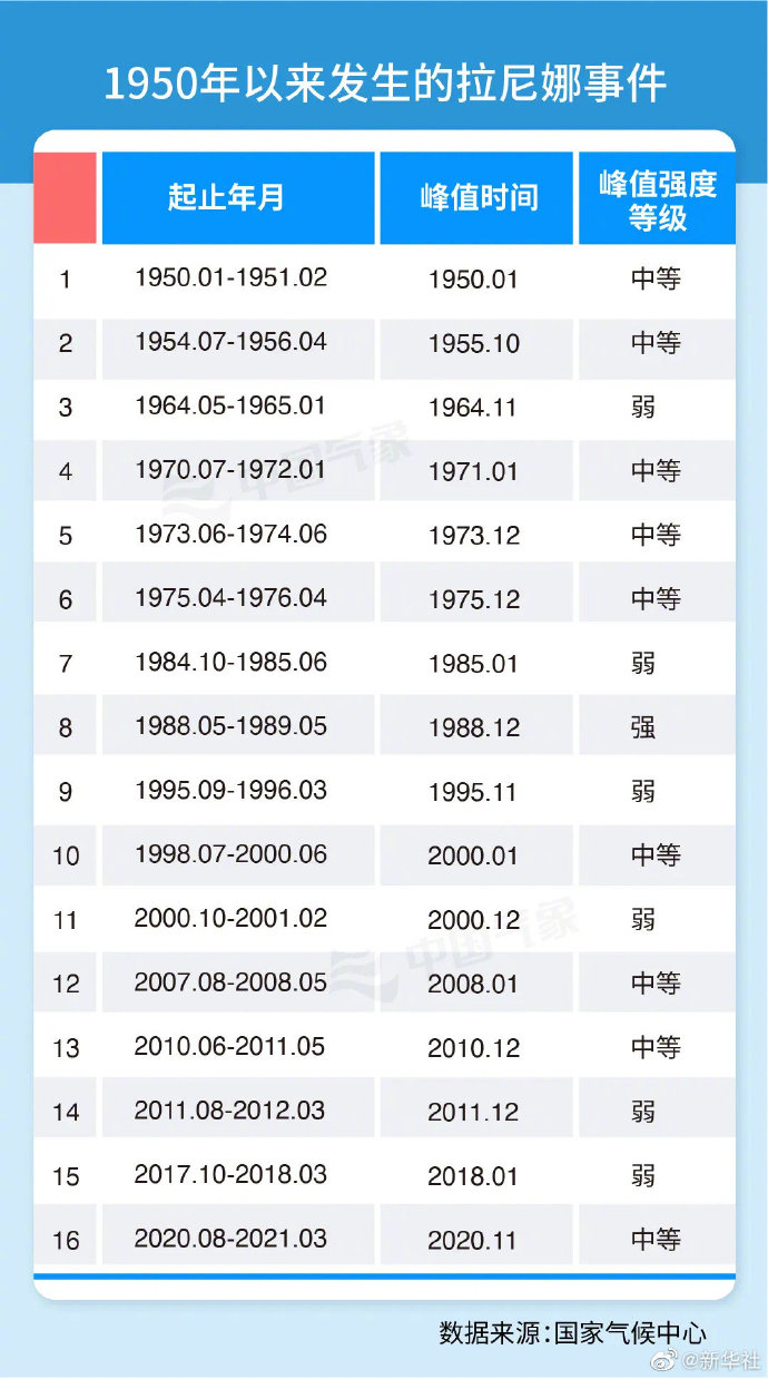 国家气候中心最新消息,今年7月以来,赤道中东太平洋海温持续下降,预计10月进入拉尼娜状态,并于冬季形成一次弱到中等强度的拉尼娜事件。鉴于2020-2021年秋冬季曾出现拉尼娜事件,2021年将是“双拉尼娜年”。