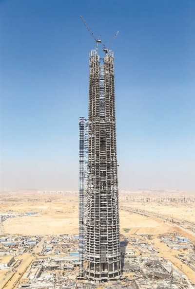 中国建筑股份有限公司埃及分公司承建的埃及新首都中央商务区项目位于开罗以东约50公里处,其中最引人注目的就是将成为“非洲第一高楼”的标志塔项目。图为9月6日,埃及新首都中央商务区标志塔建设现场。 黎炳宏摄(新华社发)