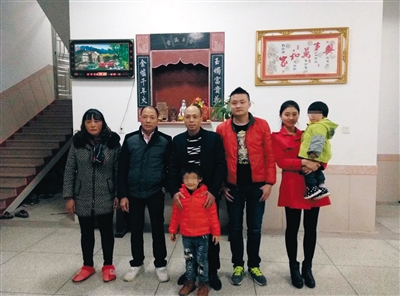蒙冤22年的许金龙被无罪释放后,暂时住到了三哥家。图为许金龙(中间扶小孩者)与三哥一家合影。 本版摄影新京报记者封莉