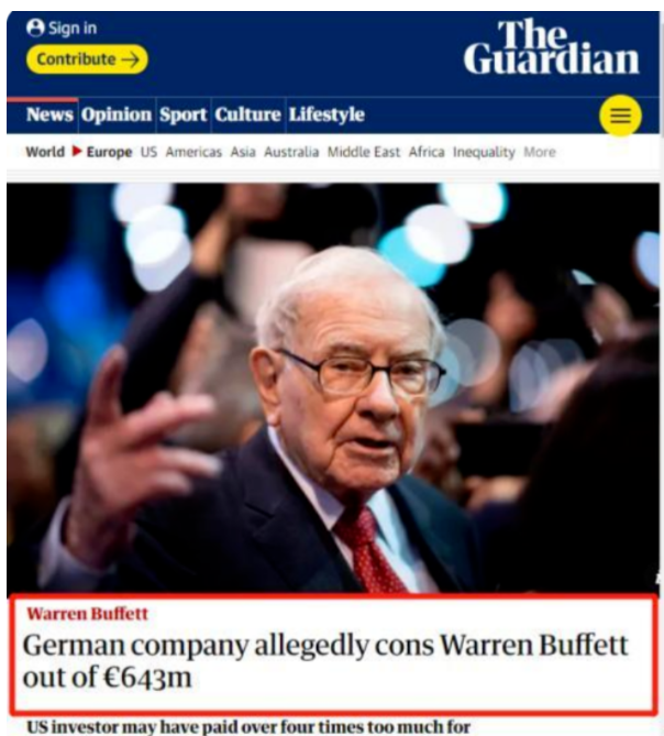 其实,这并非巴菲特“踩雷”的第一起诈骗案。就在2020年5月,英国《卫报》报道,巴菲特被一家德国制造企业设局坑骗了6.43亿欧元(约合人民币50亿元)。