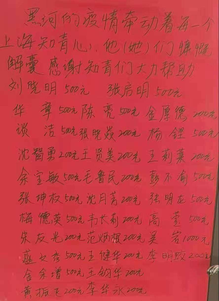 日前,一份来自上海知青的捐款名单醒目地张贴在黑河市爱辉区外二道沟村村委会的大门上。这不仅仅是一排排抽象的名字,更是一个个生动的人物形象,仿佛瞬间让人穿越到那段难忘的知青岁月,一群十八九岁充满活力的小青年在说:“你好,爱辉!加油,黑河!”