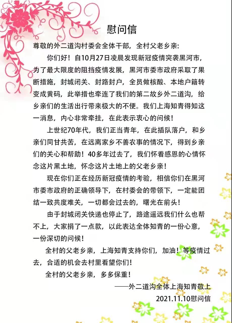 “上世纪70年代,我们在此插队落户,和乡亲们同甘共苦……得知你们正经受疫情的考验,内心非常牵挂,大家捐了一些款,希望能尽上绵薄之力……”疫情阻隔了空间的距离,却阻挡不了爱心的汇聚和真情的问候。面对突发的疫情,上海知青们主动伸出援手,表达了对这片热土深深的情谊。当地一位参与抗疫的工作人员感动地说:“这是一份来自那个年代珍贵的爱,真的让黑河、让我们每个人都感动万分。这暖心之举,也更加鼓舞了我们的斗志,坚定了战胜疫情的信心。”