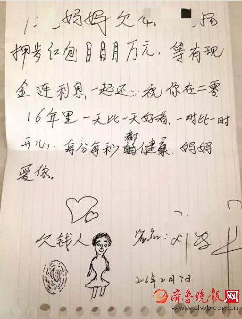她随即在朋友圈里说:早上起床就看见床头有一只快要炸掉的红包,还有妈妈放在红包里的一张欠条。这格式,这错别字,这指纹画的……