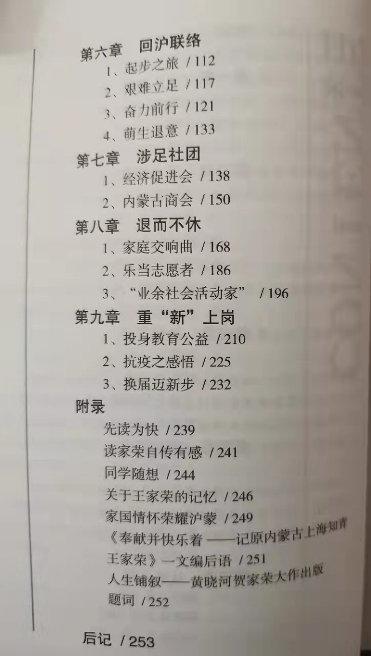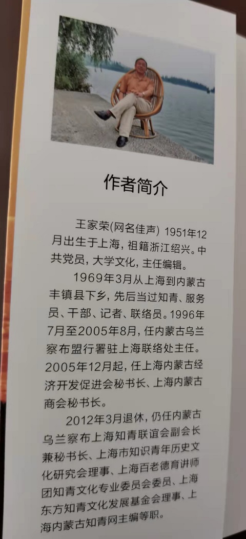 家荣兄是一个干一行爱一行的人,这在他的《人生铺叙》中都显而易见。1969年,尚未成年的他作为上海知青来到内蒙古乌兰察布盟一个偏远的山沟里上山下乡,满怀激情地在农村这个广阔天地开始了他的苦乐年华。他以苦为乐,以苦为荣,在苦闷单调的乡村生活中干得有声有色,有滋有味;抽调城里后,埋头苦干,兢兢业业又默默无闻地做着接待工作和机关文秘工作;为了圆上大学的梦,他义无反顾地舍别多少人羡慕的地区最高权力机关,走进一所普通的不能再普通的大专院校校园。在学校,他除了完成学业外,还兼任学生会主席,可谓学习工作两不误。毕业后没有重回原来的盟委机关,让不少人感到惋惜,他却说,盟委机关虽好,但做新闻采编工作更能使自己学有所长,学有所用,毅然决然地走上一个全新的岗位——乌兰察布盟广播电台编辑部,同时也开启了一条新的几乎倾注了他多半生心血的人生历程。从一个普通的编辑做起,之后编辑部主任、副台长、主持台长工作,一路虽尝尽了酸甜苦辣,但也算顺风顺水地走过了15年的新闻之路。15年中,他以自己扎实的文字基础、出色的组织能力和强烈的社会责任感,采编水平和撰稿水平突飞猛进。他组织和编辑的节目在上级电台屡获大奖,主持电台工作后,更是以前所未有的工作热情积极改革创新,把乌兰察布的新闻广播事业引领到一个新的层阶。本该顺理成章地接任台长工作,但组织上鉴于他上海知青的特殊优势,却安排他回上海组建乌兰察布盟驻沪联络处工作。这对他是一项全新的事业,也是一次痛苦的选择。多年来,他同新闻广播事业结下了深厚的感情和事业基础,他不舍离开,但组织的决定,乌兰察布改革开放大局的需要,他斟酌再三愉快地接受了。从1996年7月算起,在驻上海联络处主任位置上,他一干就是十年。十年中他克服人力、物力、经费等多种困难,为两地的经贸联系和经济协作,为乌兰察布的招商引资做了大量的工作,一直到退休后依然为两地的经济社会多方面合作做着力所能及的工作。